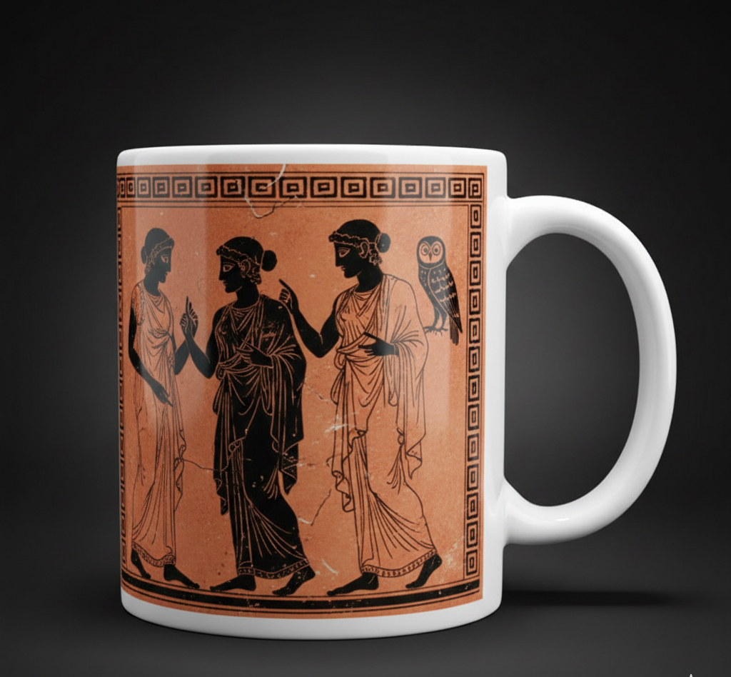The image on the mug is a depiction in the style of ancient Greek red-figure pottery, featuring three draped figures and an owl, a known symbol of the goddess Athena.The artwork mimics the red-figure technique, a popular style in Athens from around 520 BC, where figures appear in the natural red-orange color of the clay against a painted black background.