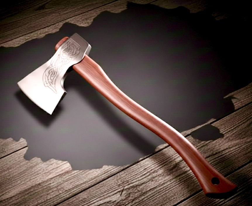 This appears to be a hand-forged Viking-style axe with an engraved blade and a wooden handle. The intricate pattern on the blade is characteristic of Norse or Celtic knot-work designs, which are popular motifs for modern replicas and custom-made pieces. Viking or Norse-inspired design, often featuring a “bearded” axe head shape. Typically crafted from high-carbon steel with a solid hardwood handle. The detailed etchings on the blade are made using various techniques, including laser engraving or traditional saltwater etching, creating a permanent design. These axes blend historical authenticity with modern craftsmanship and are often sold as collectible items, display pieces, or for light outdoor use like camping or bushcraft. They are also popular personalized gifts for special occasions.