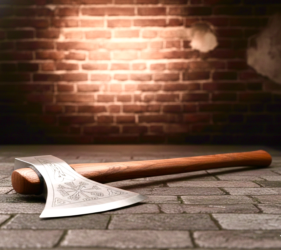 This item is a custom handmade Viking axe with intricate engravings on the carbon steel head and a polished hardwood handle. These axes are popular as decorative pieces, collectibles, and functional items for camping or hunting. The axe head features detailed engravings, including a prominent symbol that appears to be the Vegvisir, a Norse symbol often referred to as the “Viking compass”. The design on the blade is typically applied using methods like etching that make it permanent.