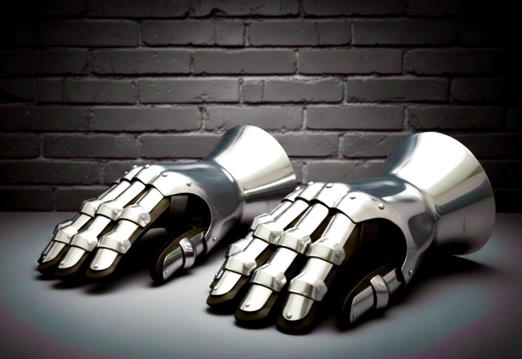 Hourglass gauntlets, a style of medieval armor known for its distinctive wrist shape that allows for greater mobility. These are made from steel and are suitable for LARP, reenactments, or display.