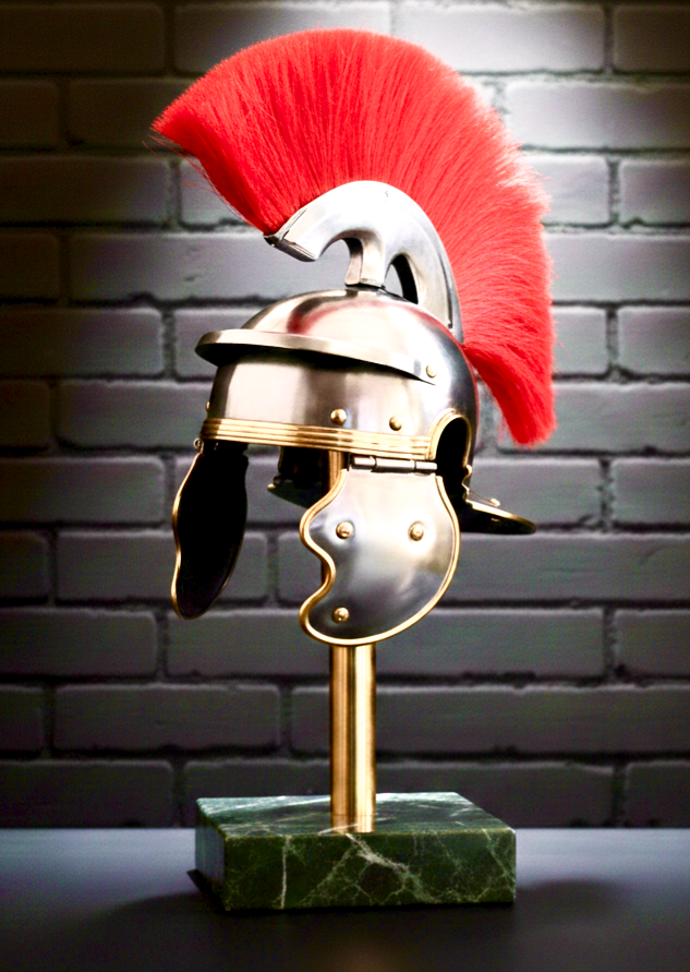 The prominent red plume or crest was used historically to help soldiers identify their officers (centurions) on the battlefield.
