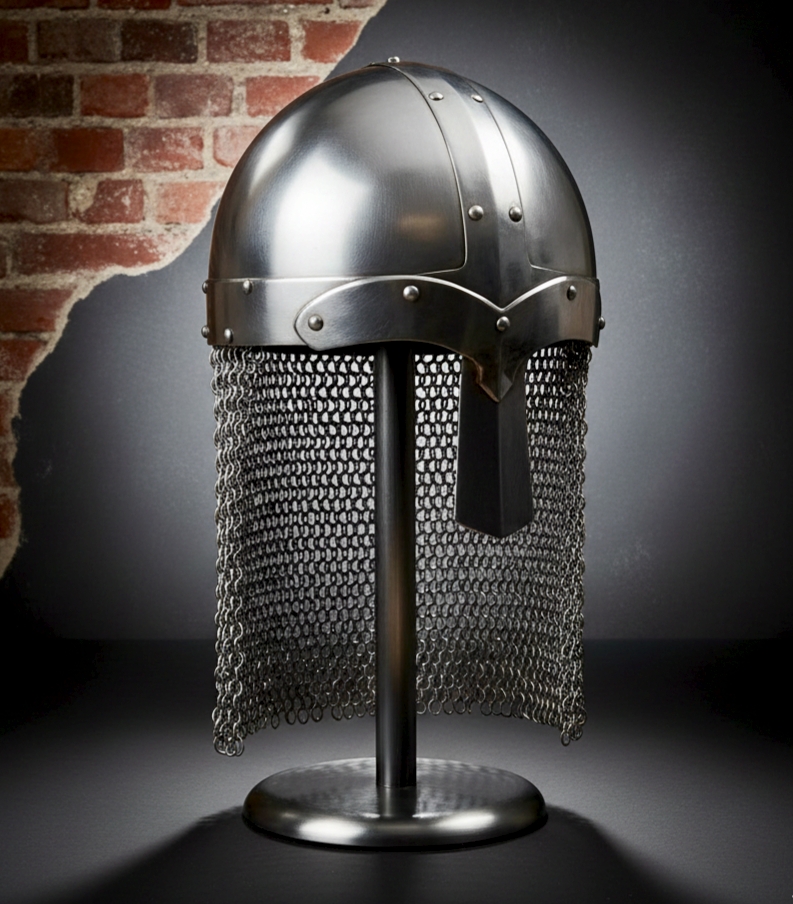 This item is a replica Norman nasal helmet with an aventail, likely made from steel.
