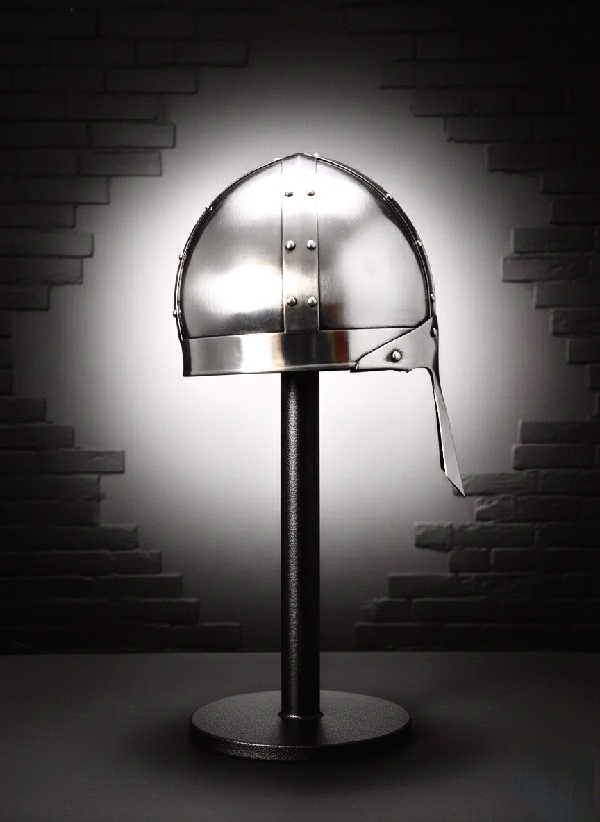 The is a replica Medieval Norman Nasal Helmet. This type of helmet was popular during the Middle Ages and is often associated with the Normans and Vikings.