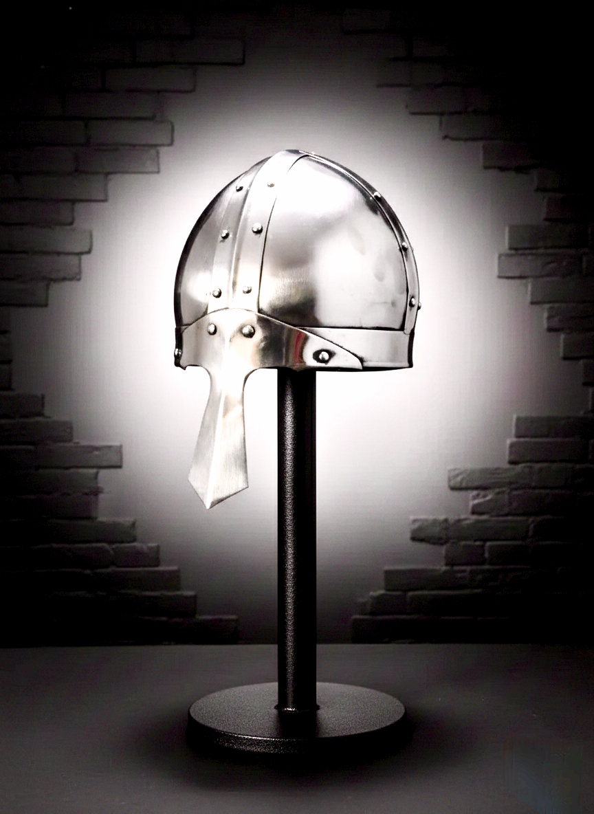 - It features a conical skull cap with a prominent nasal plate (nose guard) running down the front for face protection. A ridge provides additional reinforcement.