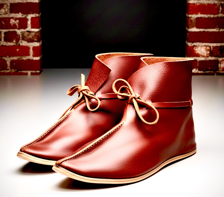These are medieval-style leather boots, often identified as Viking turn shoes or early medieval booties. They are characterized by their simple, hand-stitched construction, typically using vegetable-tanned leather and a lace-up or string closure at the ankle.