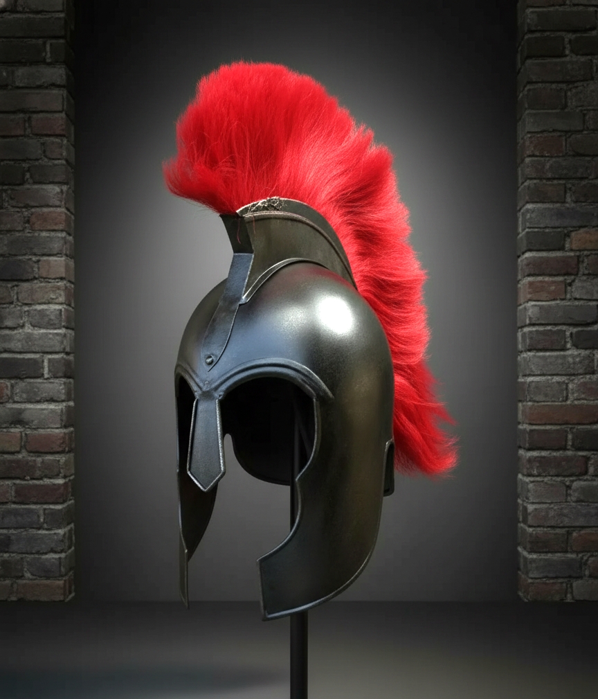 - The helmet is worn by ancient hoplites and features a striking red horsehair crest.