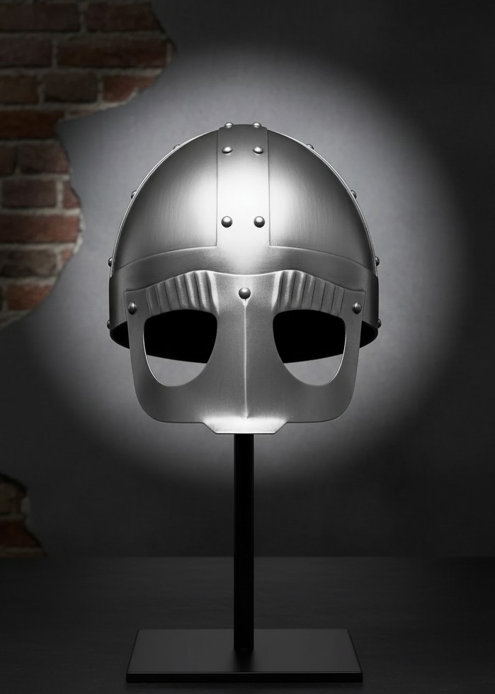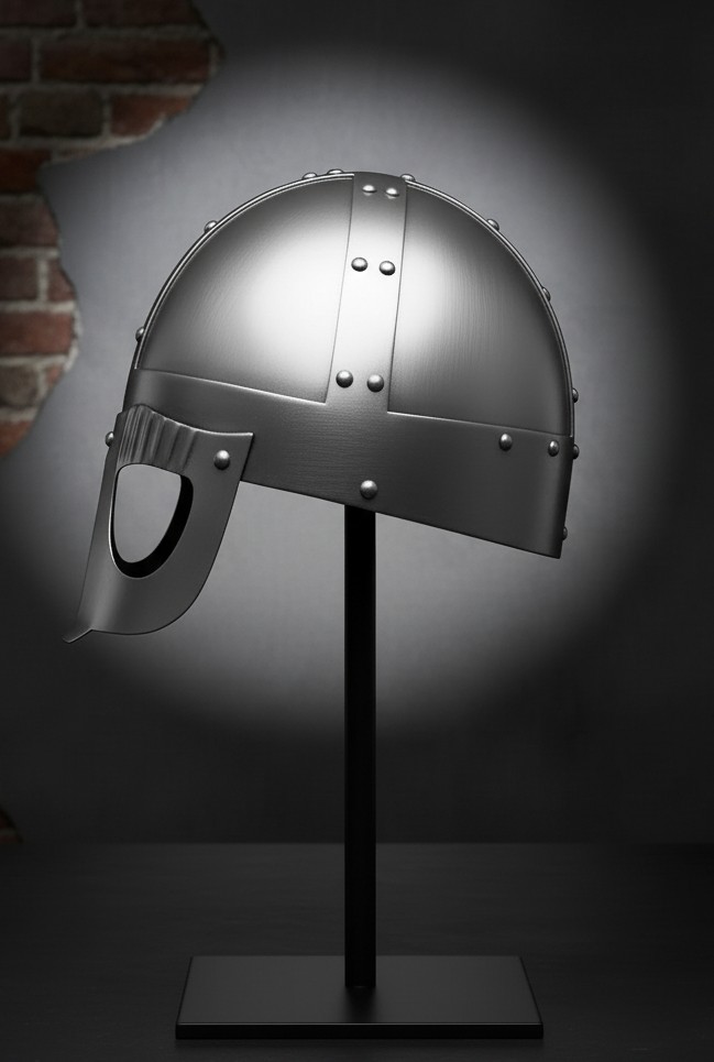 A Viking spectacle helmet isĀ a historically inspired piece of armor, often handmade from thick steel and designed for reenactments, LARP, or decoration. It features a protective “spectacle” mask over the eyes, connected to a bowl-shaped helmet by bands. These helmets are functional, coming with an adjustable leather liner and chin strap for a comfortable and secure fit.